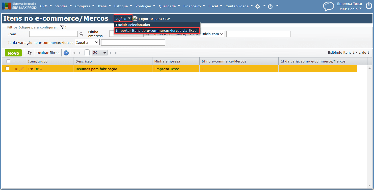 • Desenvolvida possibilidade de importar itens do e-commerce/Mercos via planilha Excel. Para mais informações sobre como exportar itens para o e-commerce integrado, clique aqui.