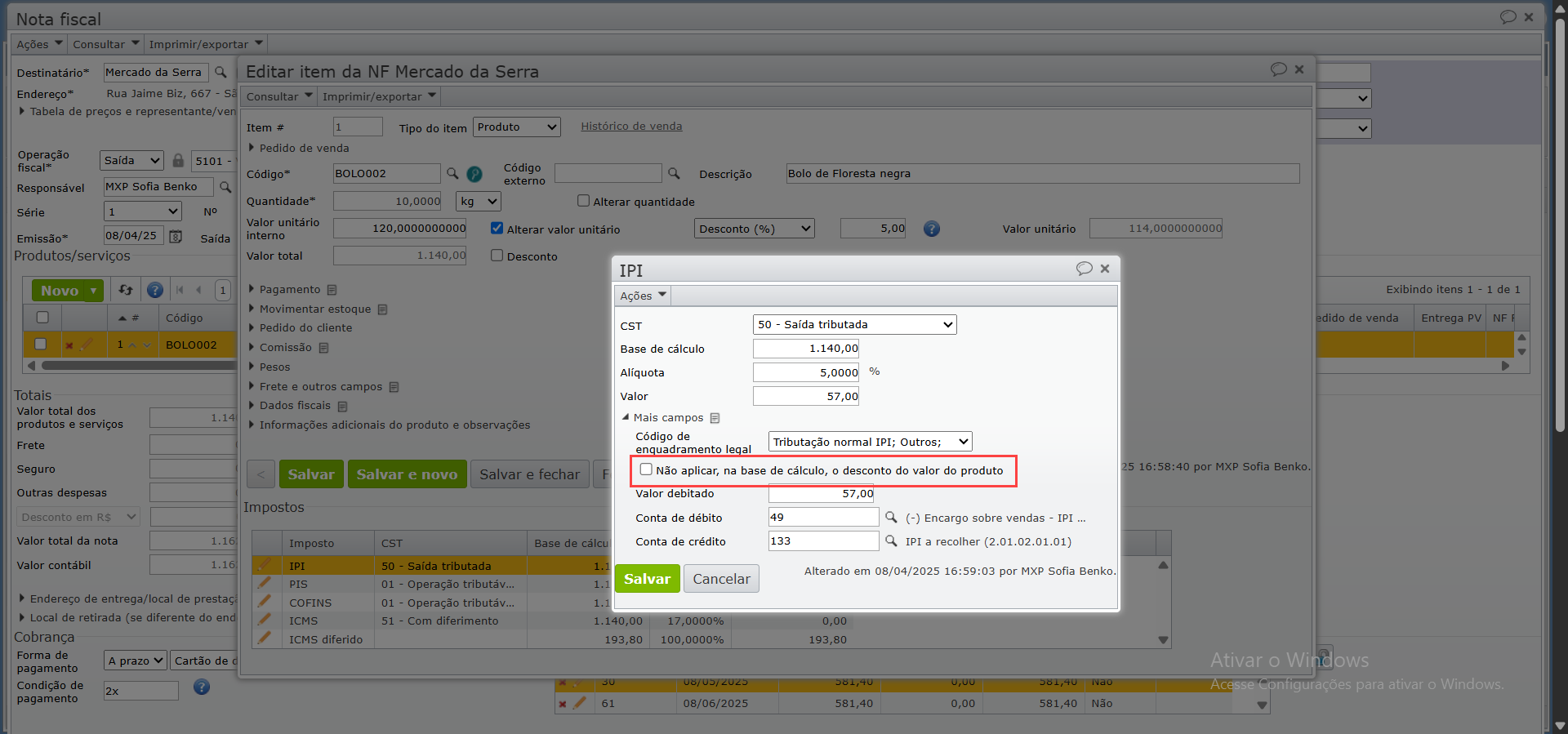 - Desenvolvida a caixa de seleção “Não aplicar, na base de cálculo, o desconto do valor do produto“, presente na edição do imposto IPI de itens das notas fiscais. Se marcado, irá informar a base de cálculo, considerando o valor do item sem descontos. Para saber mais sobre o imposto IPI, clique aqui.