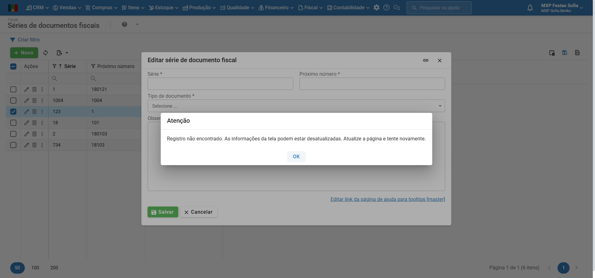 - Criada uma mensagem, retornada quando o usuário tenta realizar uma ação em um registro que não existe mais. “Registro não encontrado. As informações da tela podem estar desatualizadas. Atualize a página e tente novamente.“