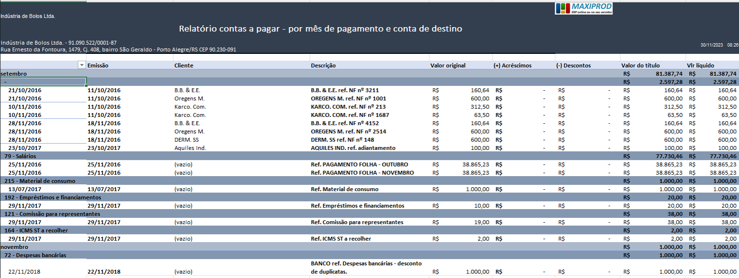 • Disponibilizado na tela contas a pagar, novo relatório nomeado “Relatório de contas a pagar – por mês e conta de destino”, para a visualização dos lançamentos a pagar ordenados por mês e conta de destino. Para saber mais sobre relatórios personalizados, clique aqui.