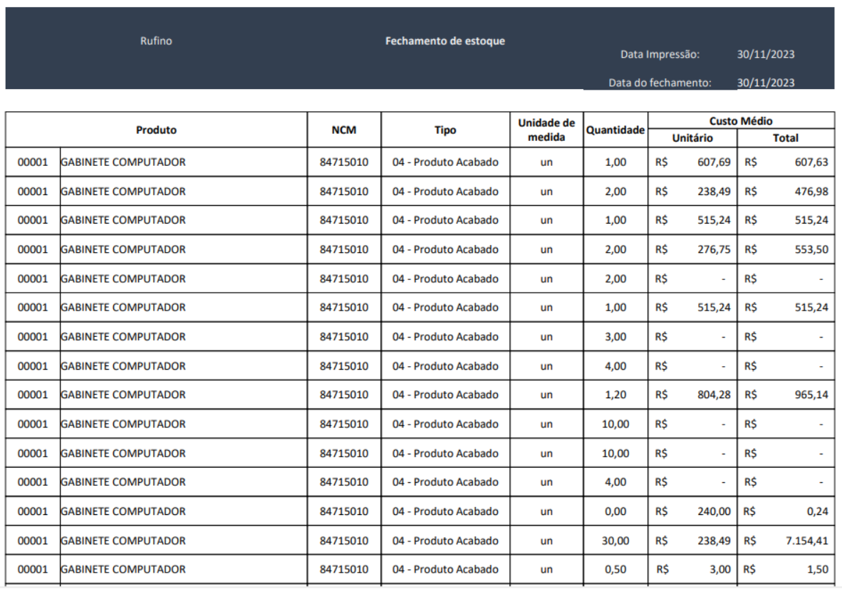 • Disponibilizado na tela de fechamento de estoque, novo relatório nomeado “Fechamento de estoque”, para a impressão de um relatório com as informações dos itens. Para saber mais sobre fechamento de estoque, clique aqui. Para saber mais sobre relatórios personalizados, clique aqui.