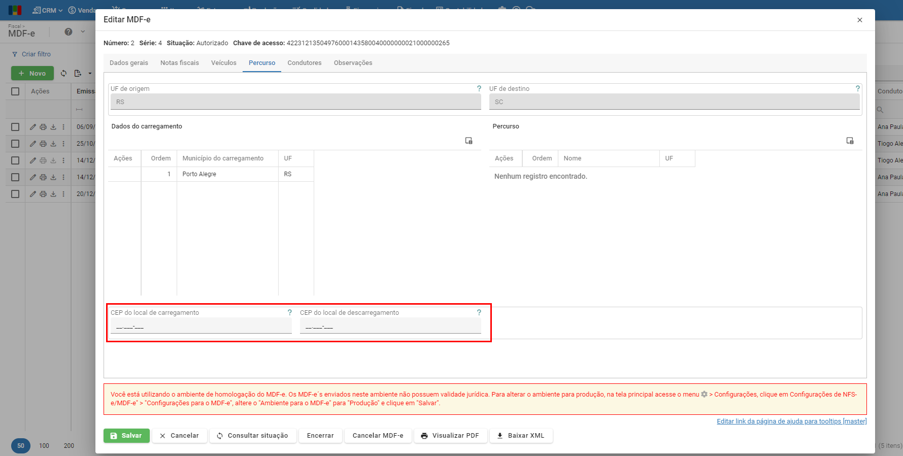 • Implementado na emissão de MDF-e, campos para informar o local de carregamento e local de descarregamento.