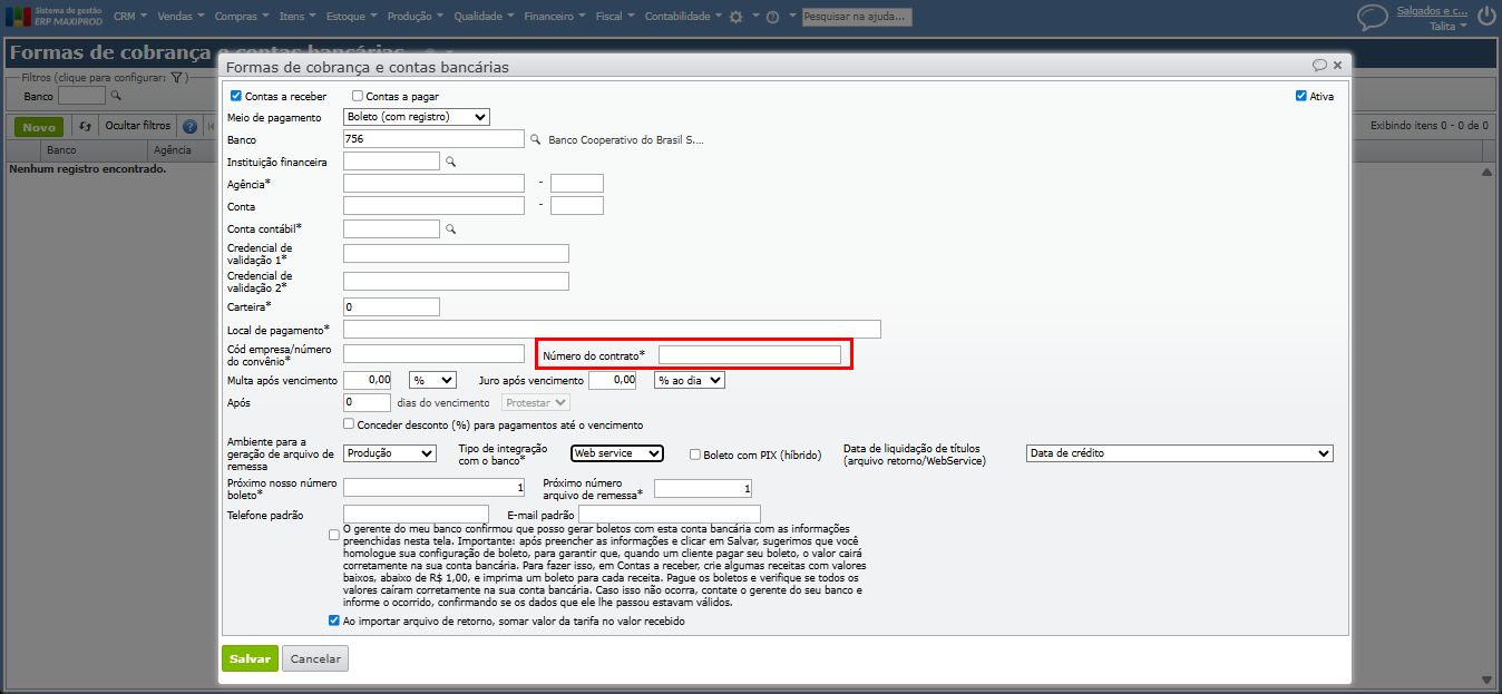 - Disponibilizado o campo “Número do contrato” no cadastro da forma de cobrança de boletos registrados via integração Web Service do Banco Sicoob. Para saber mais sobre a integração de boletos bancários via Web Service, clique aqui.