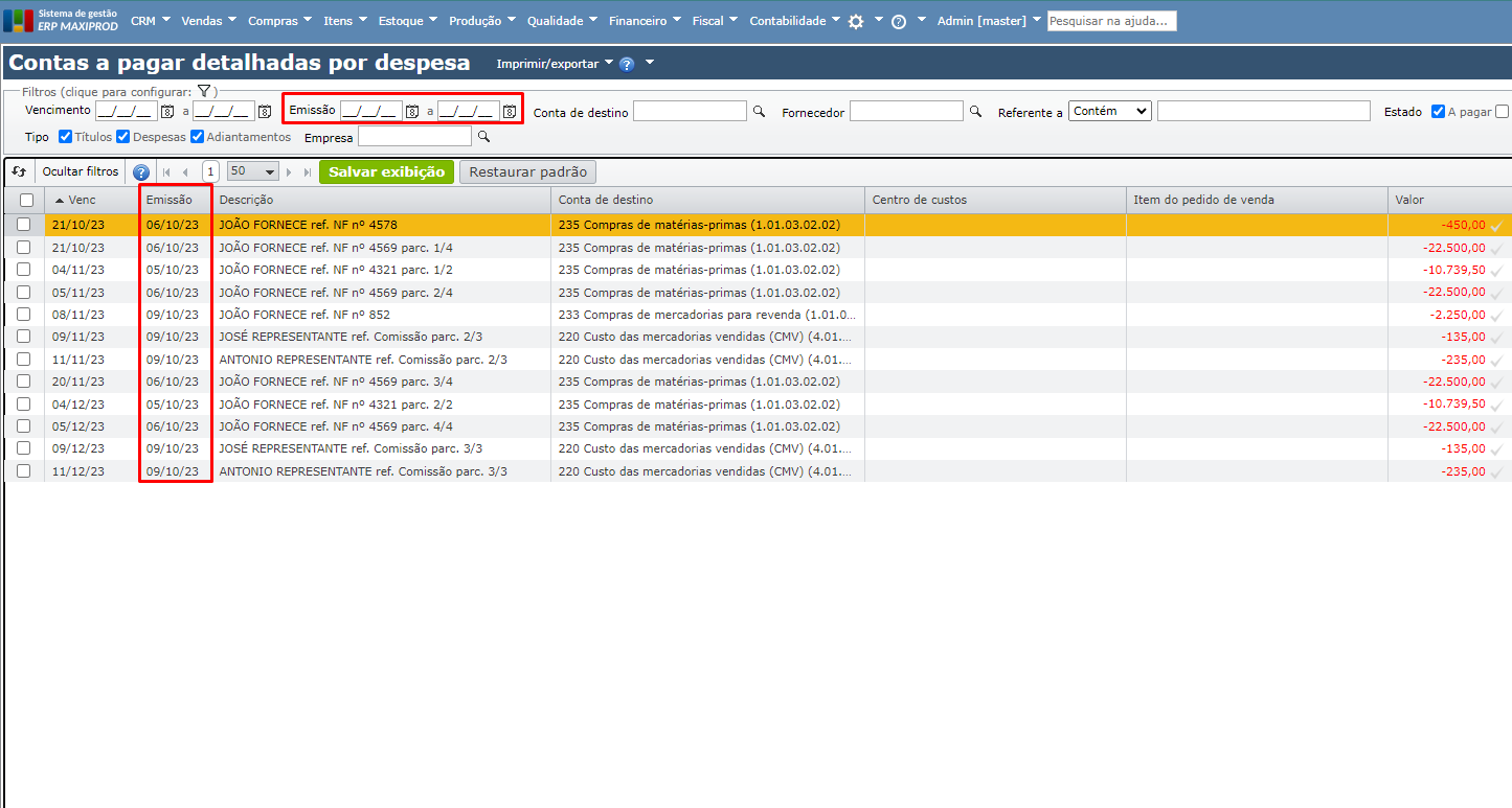 - Incluído nas telas “Contas a pagar detalhadas por despesa”, “Contas a receber detalhadas por receita” e “Fluxo de caixa detalhado por receita/despesa”, coluna e filtro para a data de emissão do título. Para saber mais sobre financeiro, clique aqui.