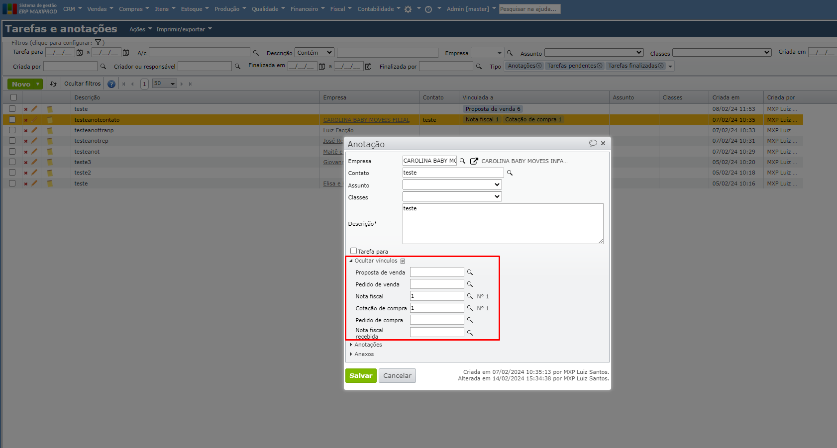 - Na edição de “Tarefas e anotações”, incluída a possibilidade de realizar o vínculo com proposta de venda, pedido de venda, nota fiscal, cotação de compra, pedido de compra e nota fiscal recebida. . Para saber mais sobre tarefas e anotações, clique aqui.