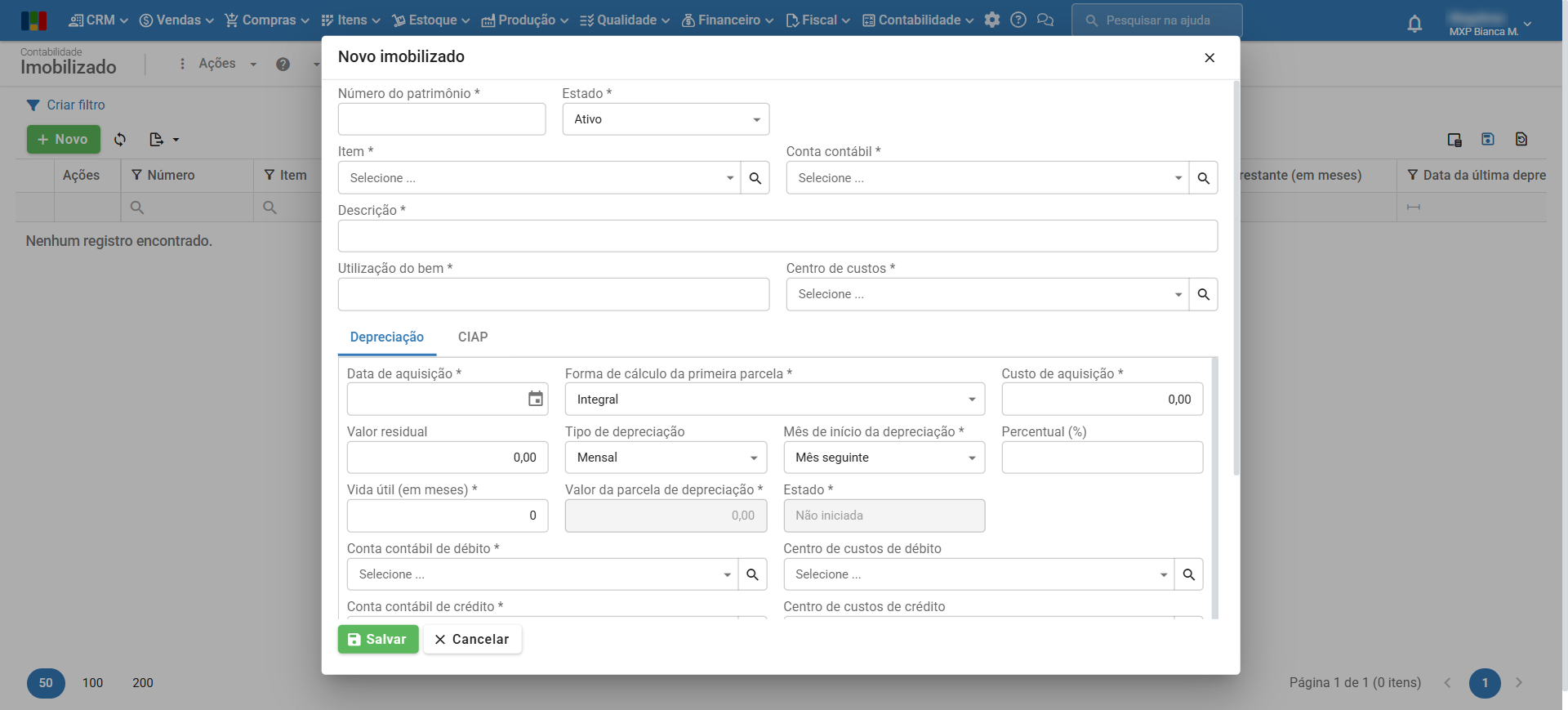 - Foram criados novos campos no cadastro do imobilizado: “Forma de cálculo da primeira parcela”, que permite definir a forma de cálculo do pagamento inicial, e “Mês de início da depreciação”, que possibilita a definição exata de quando a depreciação começará a ser aplicada ao bem. Para saber mais sobre Imobilizado, clique aqui.