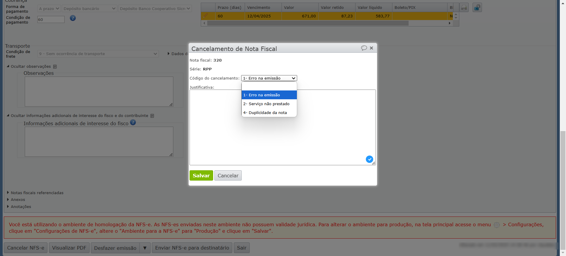 - Implementado novo campo para informação do “Código de cancelamento” na janela de cancelamento de NFS-e. Para saber mais sobre NFS-e, clique aqui.