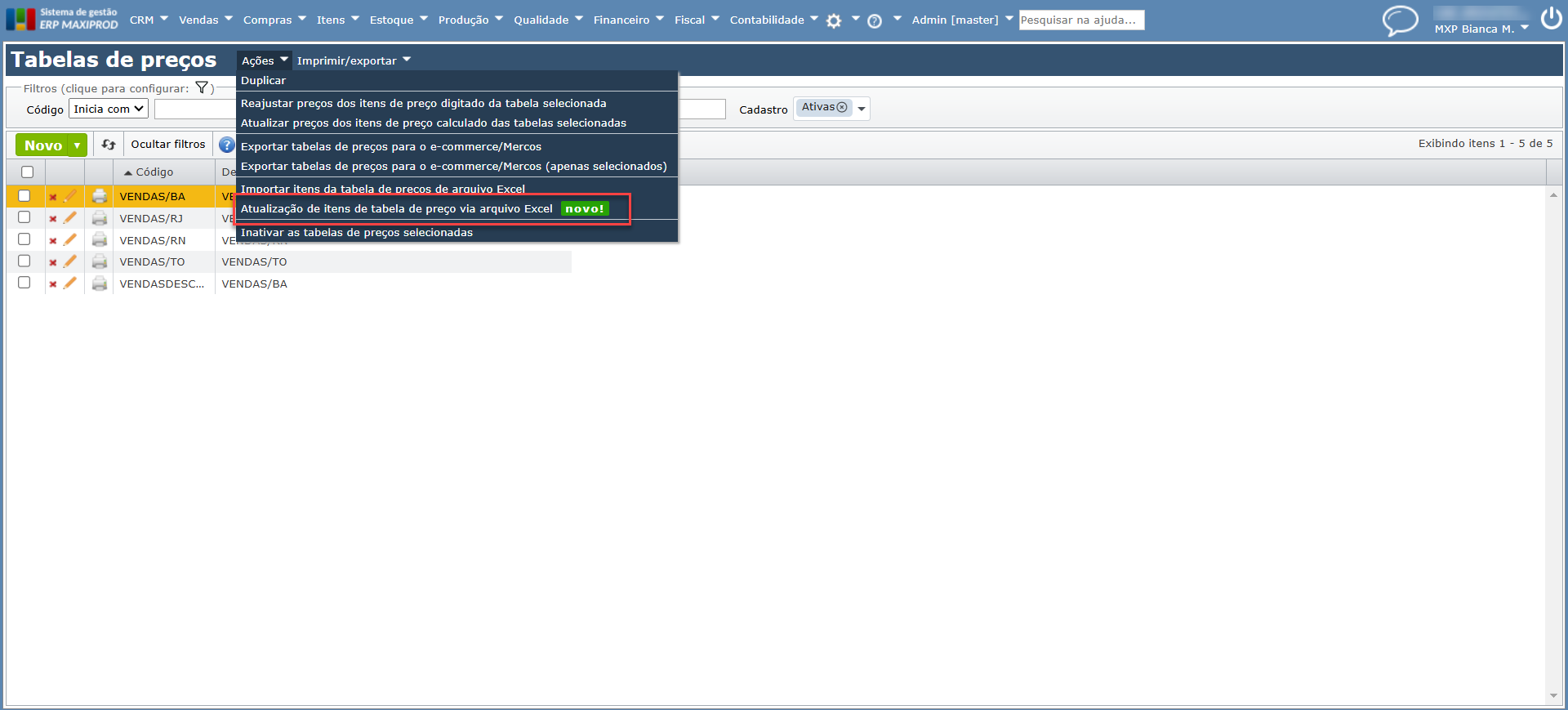 - Adicionadas novas colunas para visualização de desconto, desconto máximo e comissão nos itens da tabela de preço, além da implementação de uma planilha para atualização dos itens via Excel. Para saber mais sobre tabelas de preço, clique aqui.