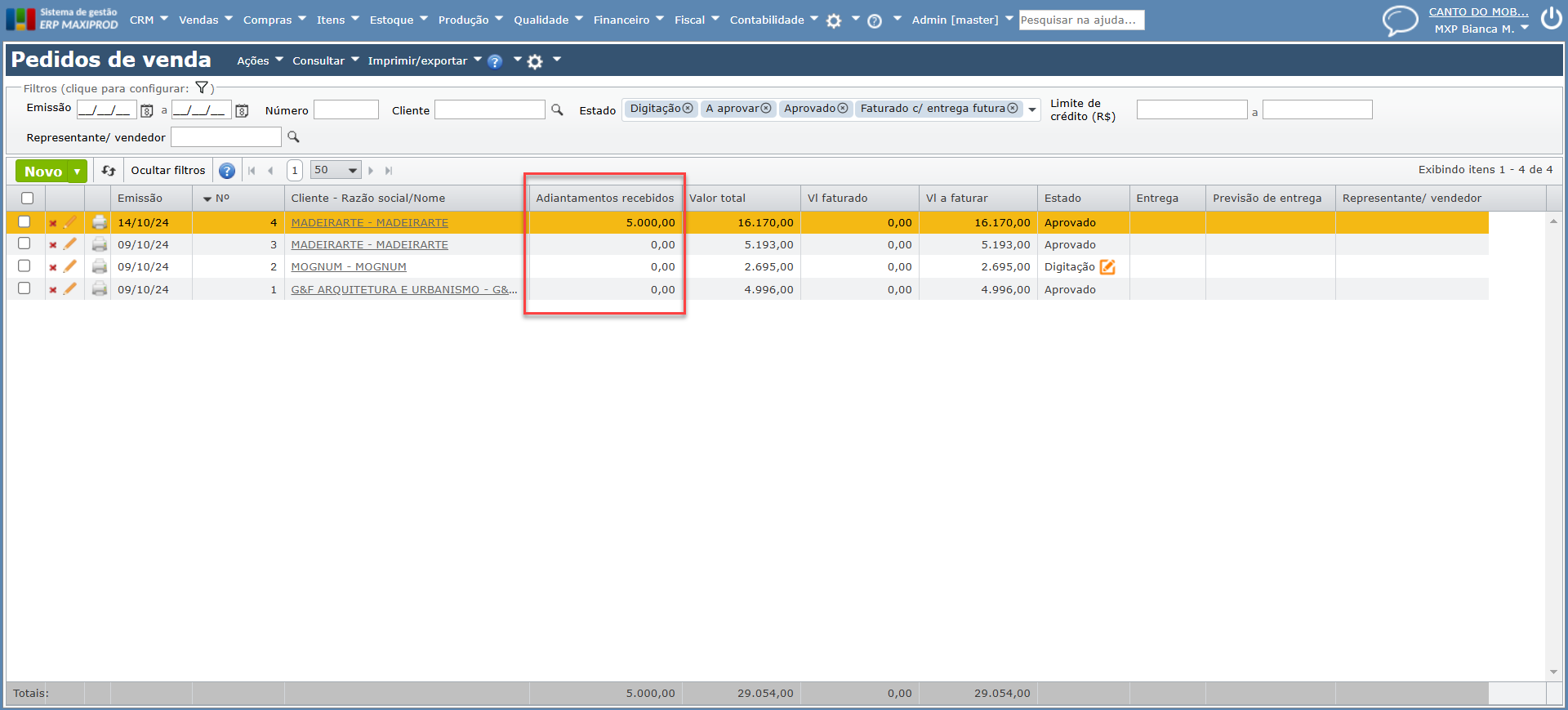 - Criada a coluna “Adiantamentos recebidos” na grade de pedidos de venda e “Adiantamentos pagos” na grade de pedidos de compra, permitindo a visualização mais ágil dos adiantamentos recebidos de clientes e pagos a fornecedores. Para saber mais sobre adiantamentos, clique aqui.