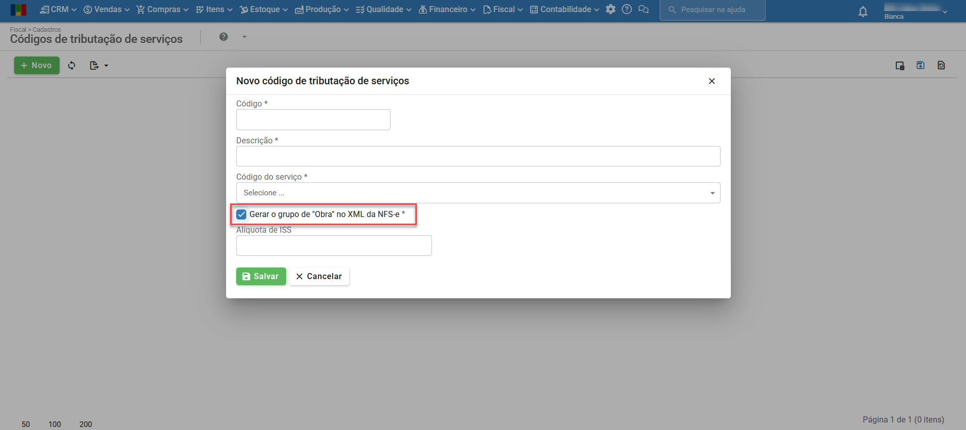 - Adicionado no cadastro de códigos de tributação de serviços, novo campo “Gerar o grupo de “Obra” no MXL da NFS-e”, para possibilitar a inserção do endereço da obra na emissão de NFS-e. Para saber mais sobre NFS-e, clique aqui.