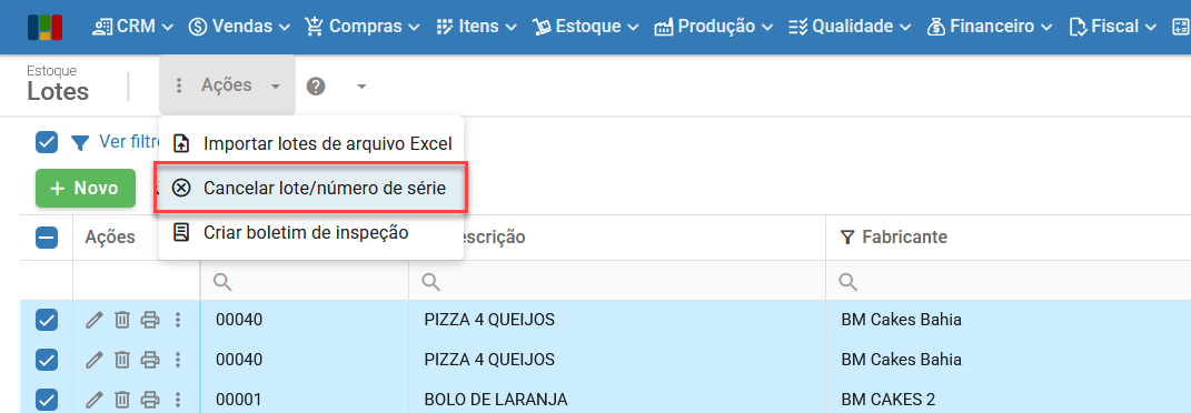 - Adicionada funcionalidade para cancelamento de lote e números de série em massa, oferecendo mais agilidade no processo. Para saber mais sobre lotes e rastreabilidade, clique aqui.
