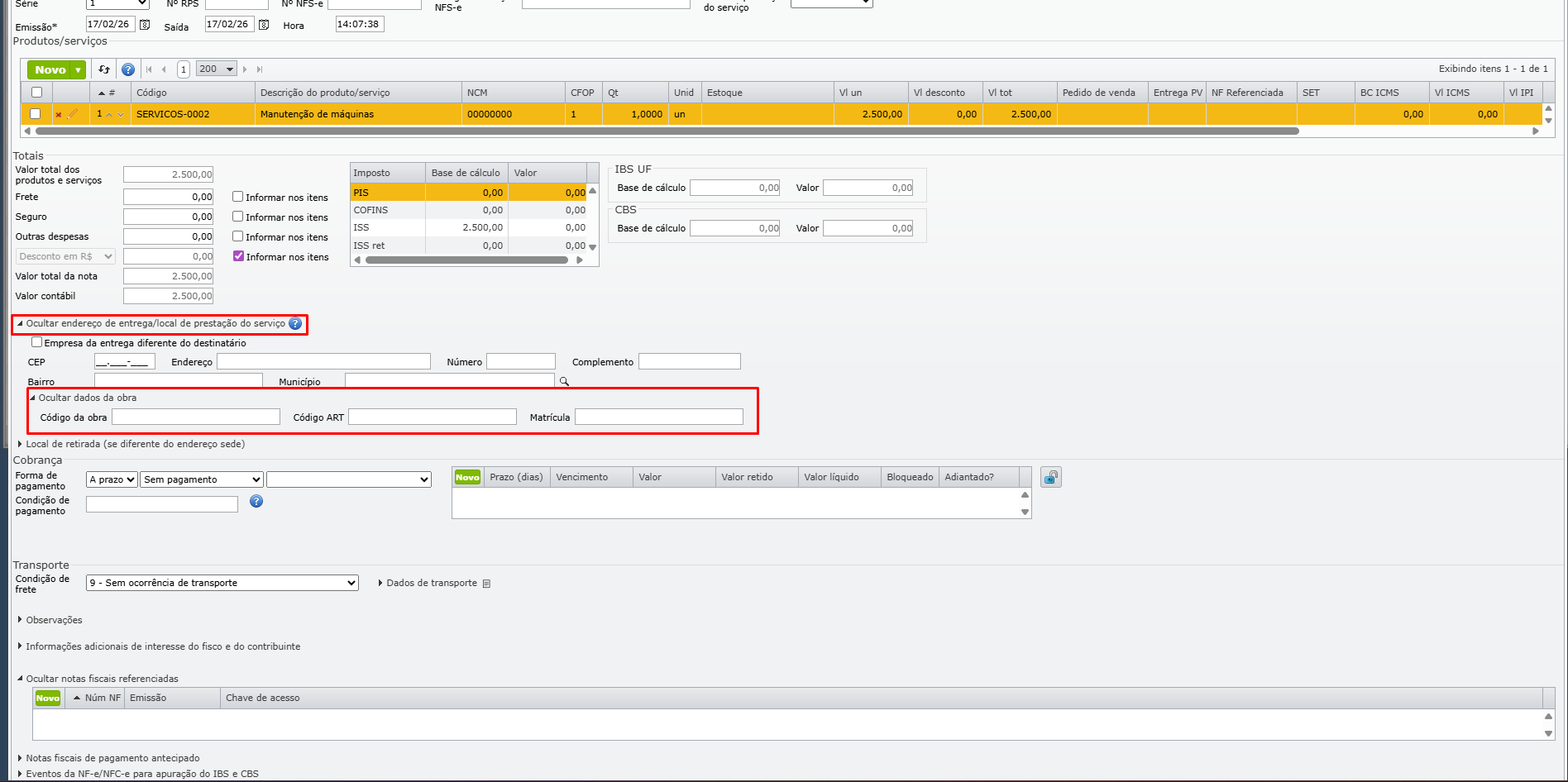 - Criados os campos “Código da Obra”, “Código ART” e “Matrícula da Obra” para emissão da NFS-e no padrão Nacional. Para saber mais, clique aqui.