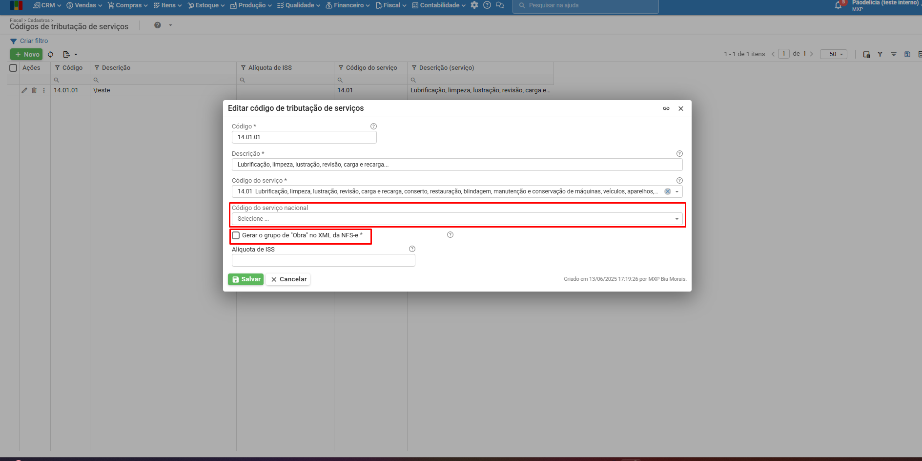 - Criada a caixa de seleção “Gerar o grupo de “Obra” no XML da NFS-e” no cadastro de código de tributação de serviços. Para saber mais sobre o preenchimento, clique aqui.