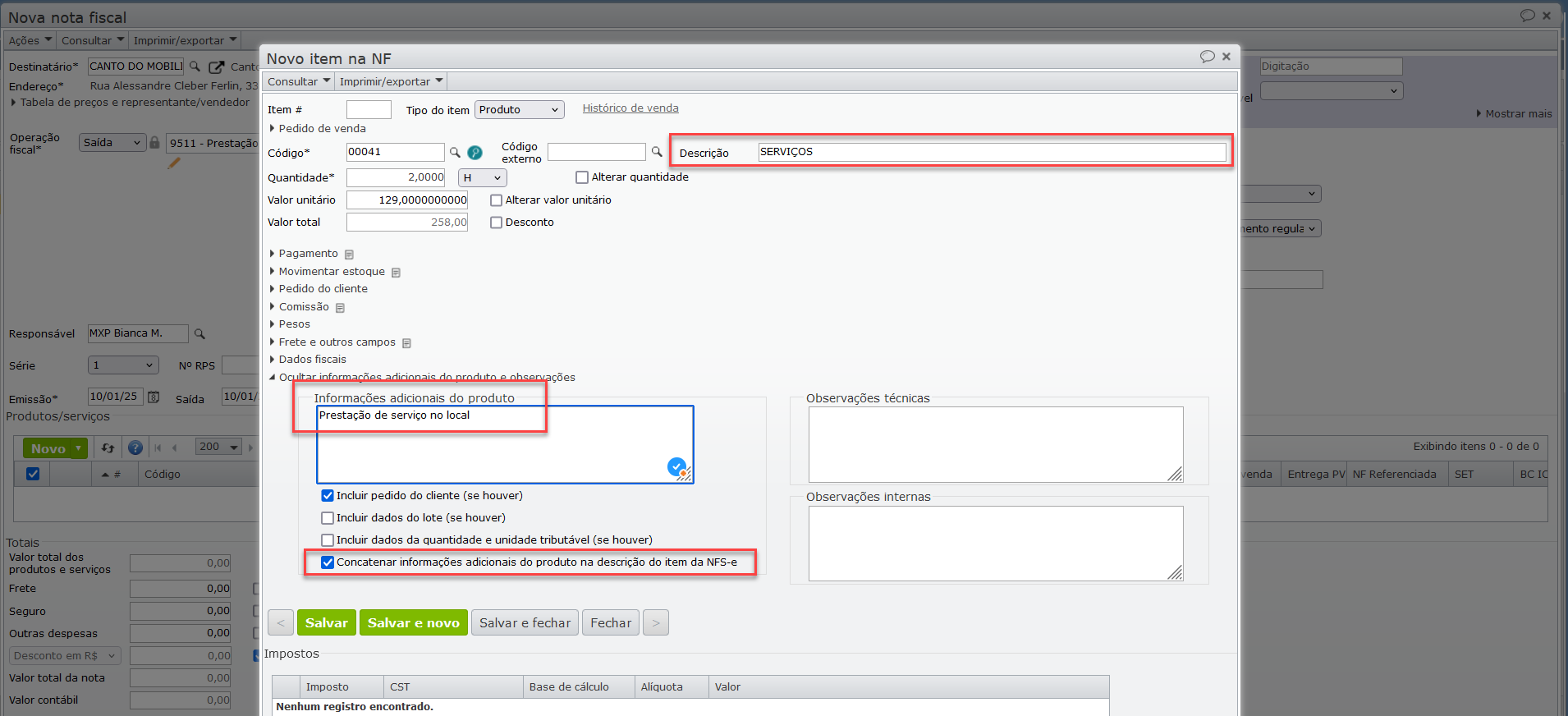 - Criado novo parâmetro em item de nota fiscal que, se marcado, preencherá a tag de descrição do item com a concatenação dos campos “Descrição” e “Informações adicionais do produto”, na nota de serviço (NFS-e). Para saber mais sobre NFS-e, clique aqui.