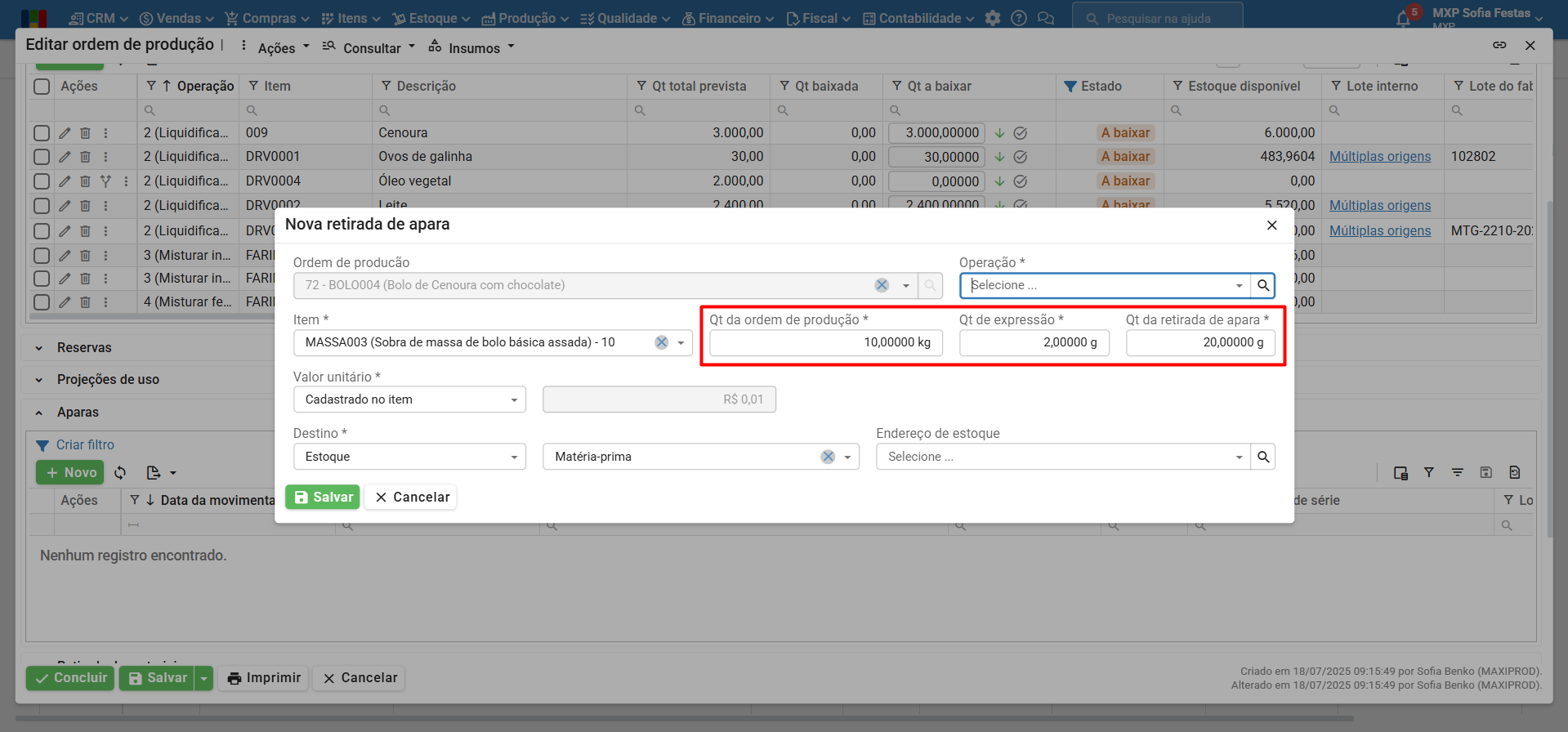 - Na nova versão de ordens de produção, ao retirar aparas, o sistema pode recalcular a quantidade a ser retirada, por meio da alteração dos campos marcados abaixo. Por padrão, eles são preenchidos com a quantidade produzida da OP e a expressão informada no cadastro do item, resultando no cálculo da quantidade a ser retirada. Para saber mais sobre a nova versão das ordens de produção, clique aqui.