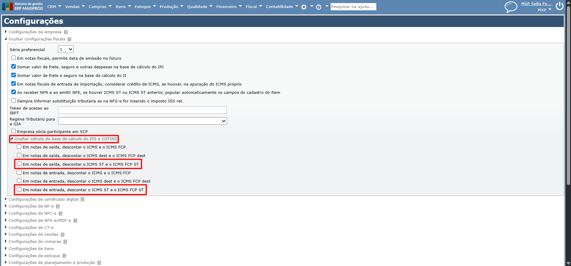 - Criada uma configuração, presente em “Roda dentada > Configurações > Configurações fiscais“, que desconta o ICMS ST da base de cálculo dos impostos PIS e COFINS, tanto para notas de saída, quanto de entrada. Para saber mais sobre como configurar o ICMS ST, clique aqui.