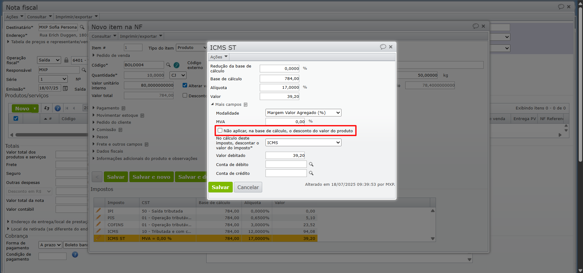 - Na tela de edição do imposto ICMS ST, foi criado o campo “Não aplicar, na base de cálculo, o desconto do valor do produto“, que, se marcado, irá desconsiderar o desconto aplicado no item em sua base de cálculo. Para saber mais sobre configurações de impostos a partir da operação fiscal, clique aqui.