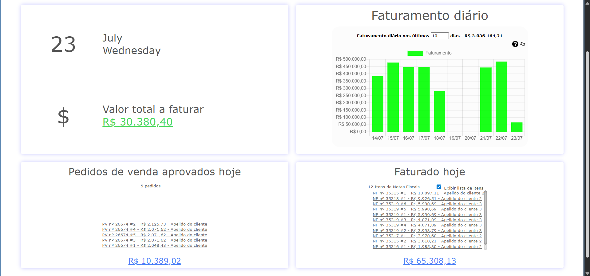 - Melhoria realizada no Painel de controle comercial, calculando os valores totais com base nos itens dos pedidos de venda e das notas fiscais. Desta forma, o cálculo dos saldos se tornou mais preciso, facilitando o acompanhamento diário do faturamento de sua empresa. Para saber mais sobre o Painel de controle comercial, clique aqui.