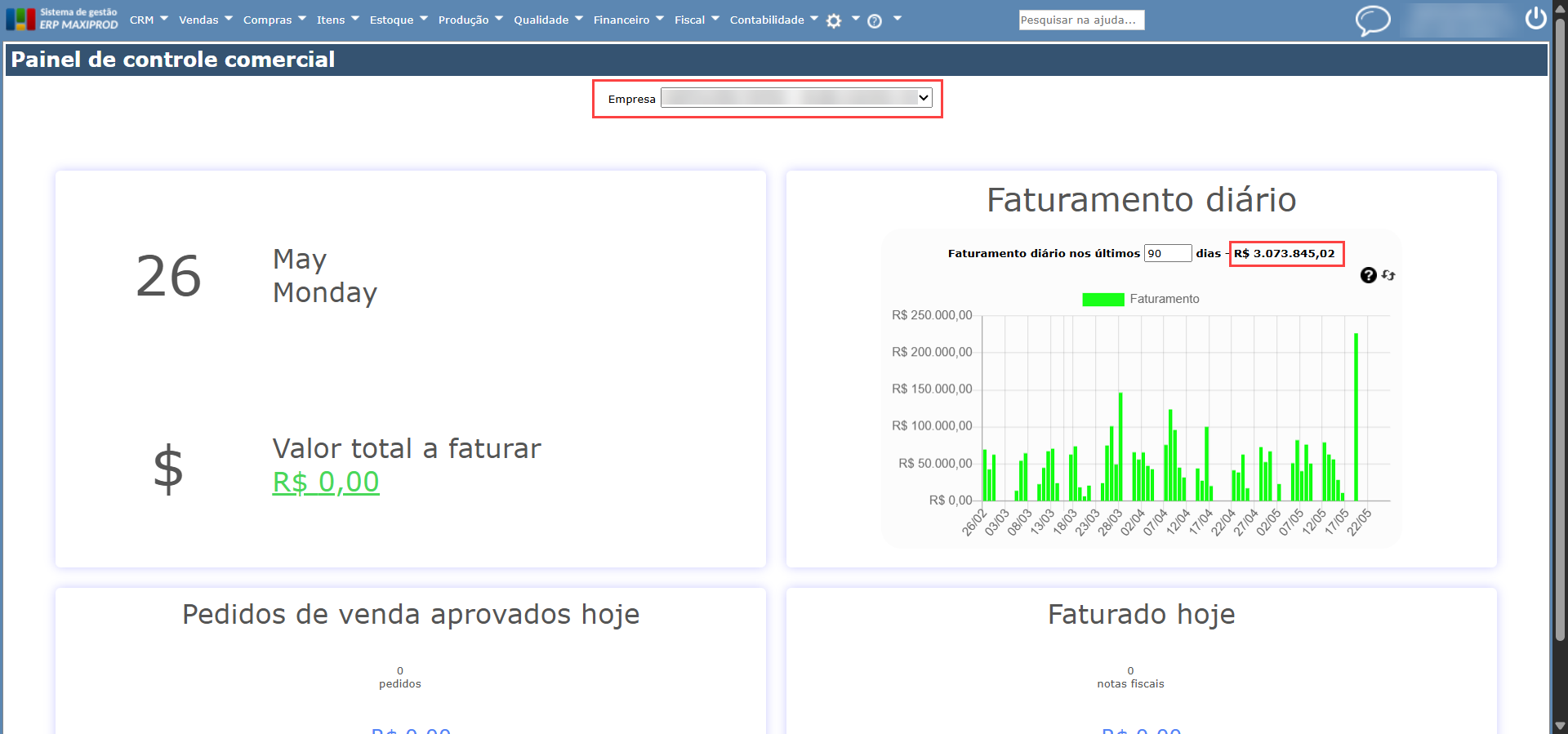 • Alterações no “Painel de controle comercial”, exibindo o valor total do intervalo filtrado no painel “Faturamento diário”, e incluso o filtro “Empresa”, possibilitando buscar os dados de uma filial específica ou de todos os CNPJs contratados. Para saber mais sobre o painel de controle comercial, clique aqui.