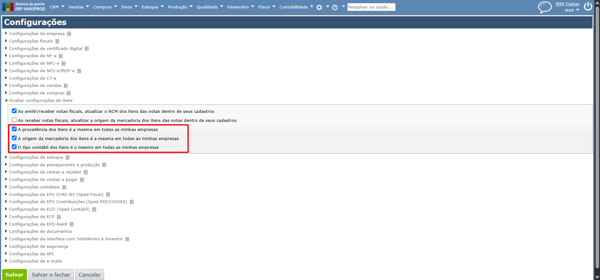 • Foi desenvolvida a possibilidade de tornar as propriedades de itens “Procedência”, “Origem da mercadoria” e “Tipo contábil” independentes para cada CNPJ. Ao desmarcar as caixas de seleção abaixo, disponíveis em “Roda dentada > Configurações > Configurações de itens”, o sistema permitirá que cadastre procedência, origem da mercadoria e tipo contábil diferentes para um mesmo item, em filiais diferentes. Para saber mais sobre o compartilhamento de dados entre múltiplos CNPJ, clique aqui.