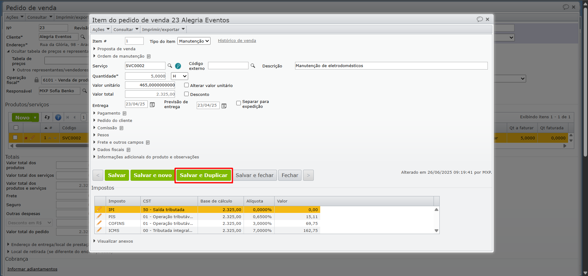 • Criado o botão “Salvar e duplicar”, disponível na tela de edição de itens de pedidos de venda, compra, notas fiscais, entre outros. Clicando nele, além de salvar a edição do item atual, os campos preenchidos são copiados para um novo item do pedido, NF-e, etc, tornando o processo mais ágil.