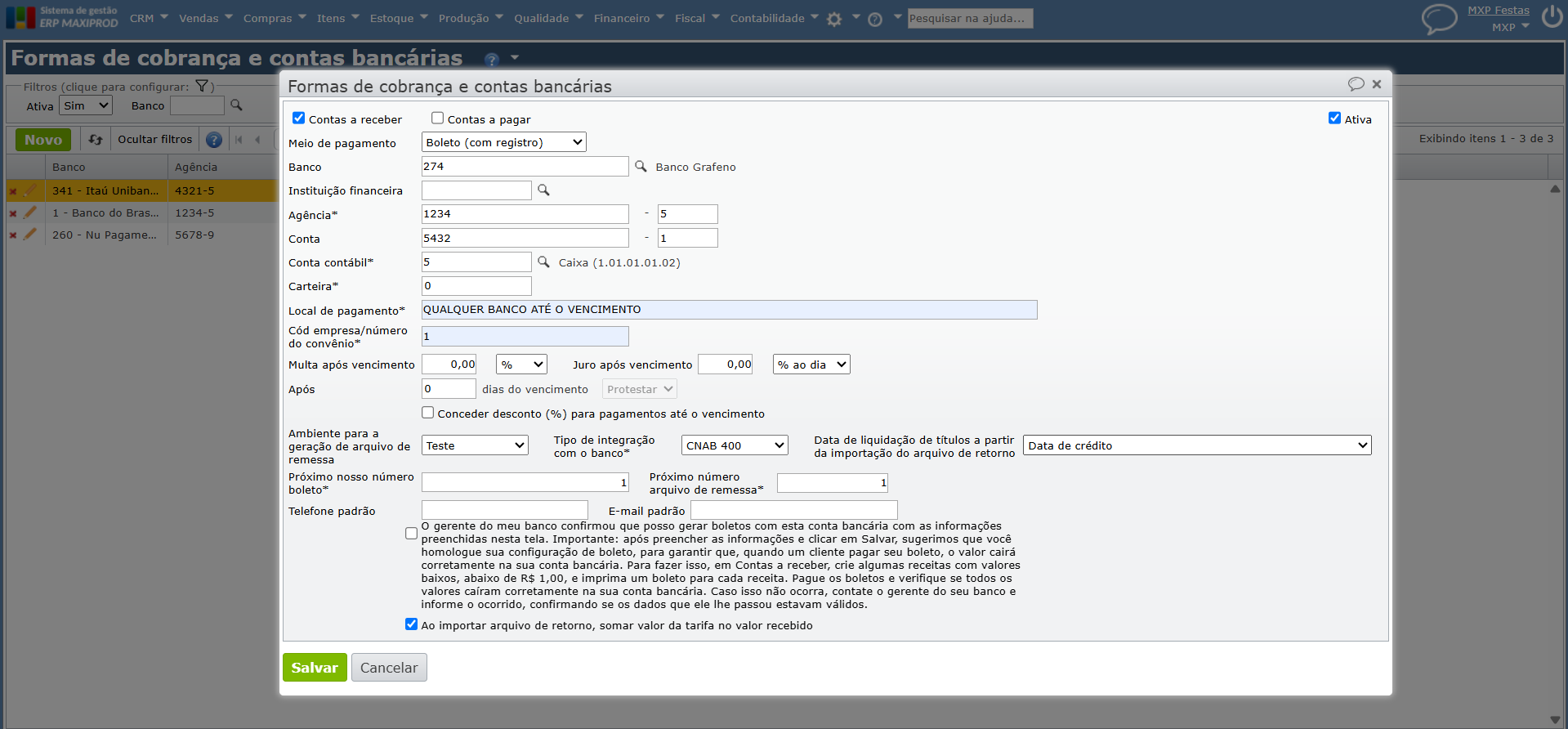 • Realizada a integração CNAB 400 com o Banco Grafeno, possibilitando a geração de boletos deste banco no ERP MAXIPROD. Para saber mais sobre a geração de boletos bancários e sua integração, clique aqui.