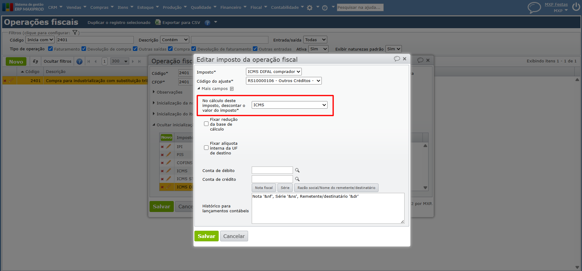 • Incluída a caixa de seleção “No cálculo deste imposto, descontar o valor do imposto” para o ICMS DIFAL comprador, que define o imposto (ICMS ou ICMS teórico) a ser deduzido do cálculo.  Para saber mais sobre o ICMS DIFAL comprador no ERP MAXIPROD, clique aqui.