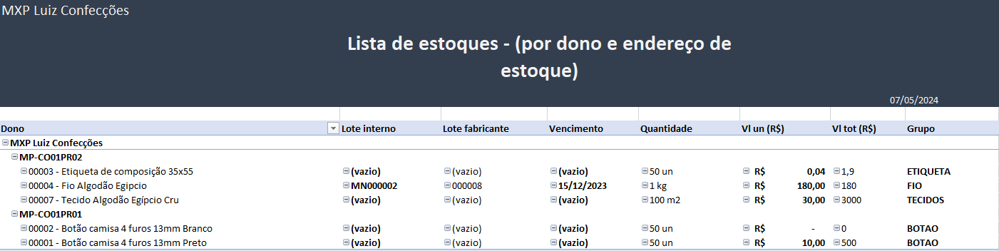 - Disponibilizado na tela de estoque, relatório nomeado “Estoque – agrupado por dono e endereço”, para a exibição detalhada dos itens disponíveis por dono e endereço de estoque. Para saber mais sobre relatórios personalizados, clique aqui.