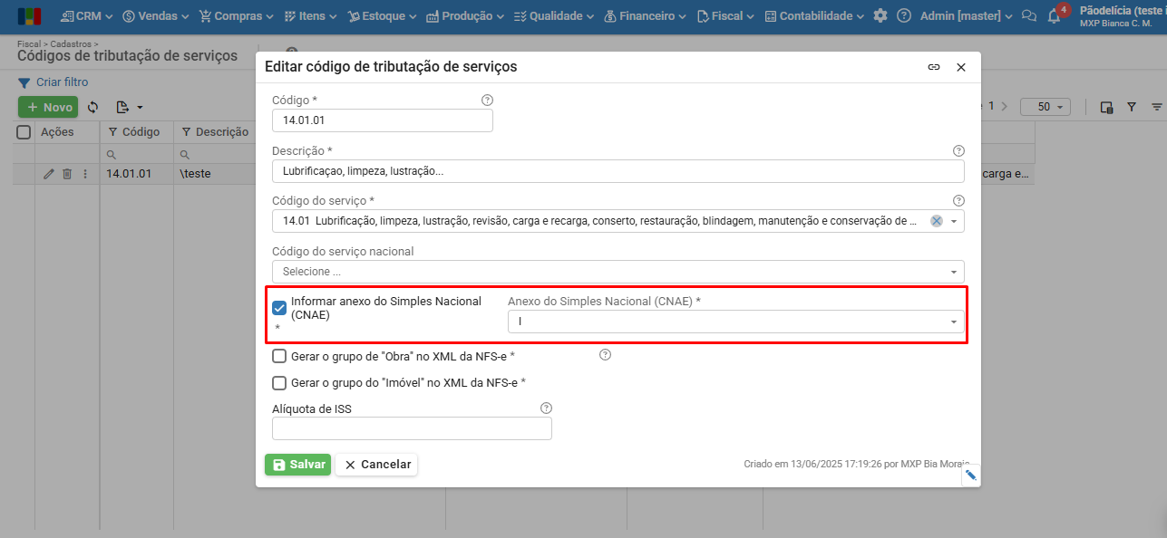 - Criada configuração para preenchimento do anexo do Simples Nacional (CNAE) em “Fiscal > Cadastros > Códigos de tributação de serviços”. Para saber mais sobre códigos de tributação, clique aqui.