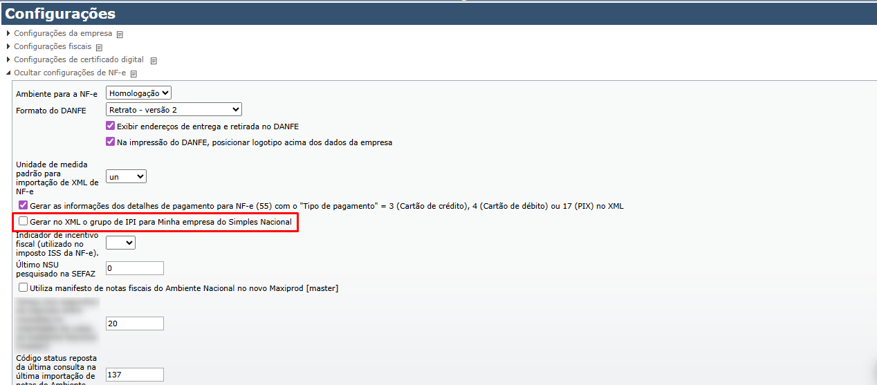 - Criada configuração para gerar grupo de TAGs do IPI (Imposto sobre Produtos Industrializados) no XML de NF-e para empresas optantes pelo Simples Nacional. Para saber mais sobre o IPI, clique aqui.