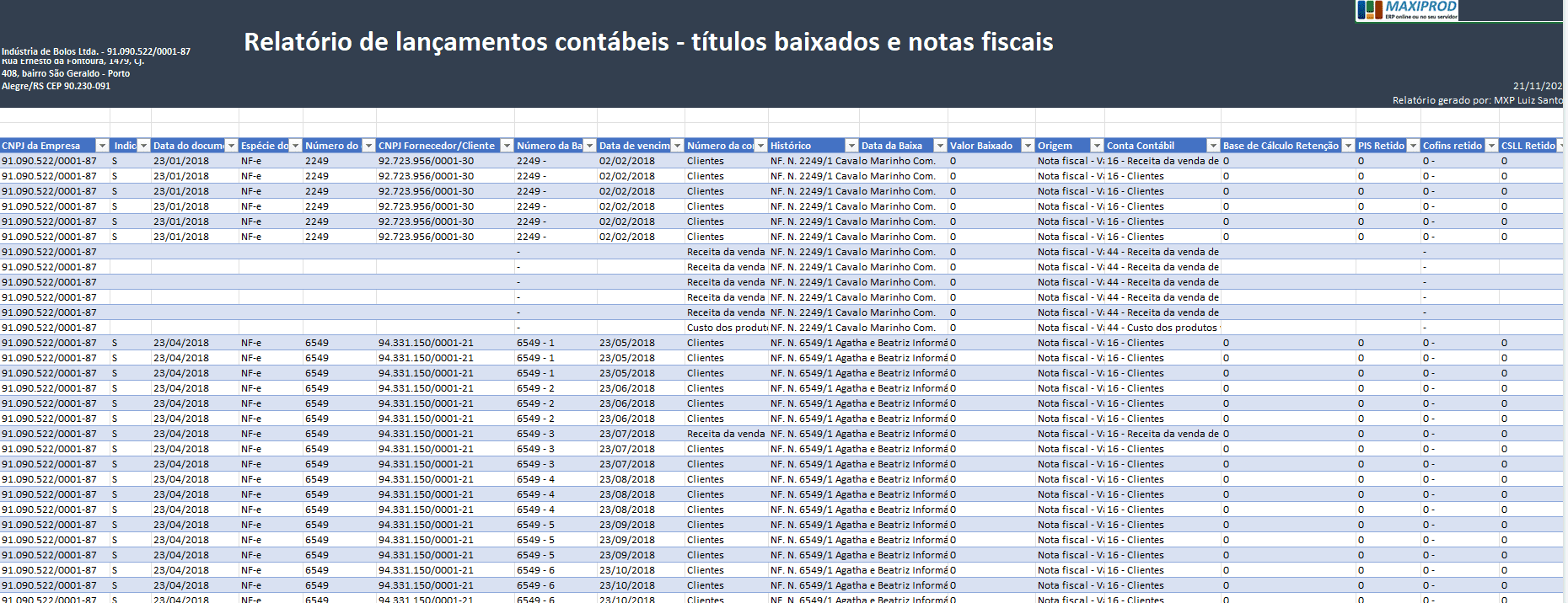 - Disponibilizado na tela de Lançamentos contábeis, novo relatório nomeado “Lançamentos contábeis – baixas de títulos e notas fiscais (APENAS EXCEL)”, para a visualização dos lançamentos associados a baixa de títulos, valores de notas fiscais, impostos de notas fiscais, juros e descontos associados a baixa de títulos. Para saber mais sobre relatórios personalizados, clique aqui.