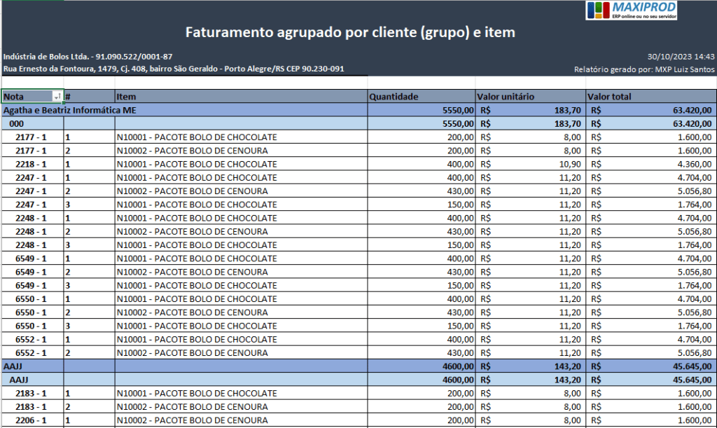 - Disponibilizado na tela de notas fiscais, novo relatório nomeado “Faturamento agrupado por cliente (grupo) e item”, para listar os itens vendidos agrupados por grupo de empresa. Para saber mais sobre relatórios personalizados, clique aqui.