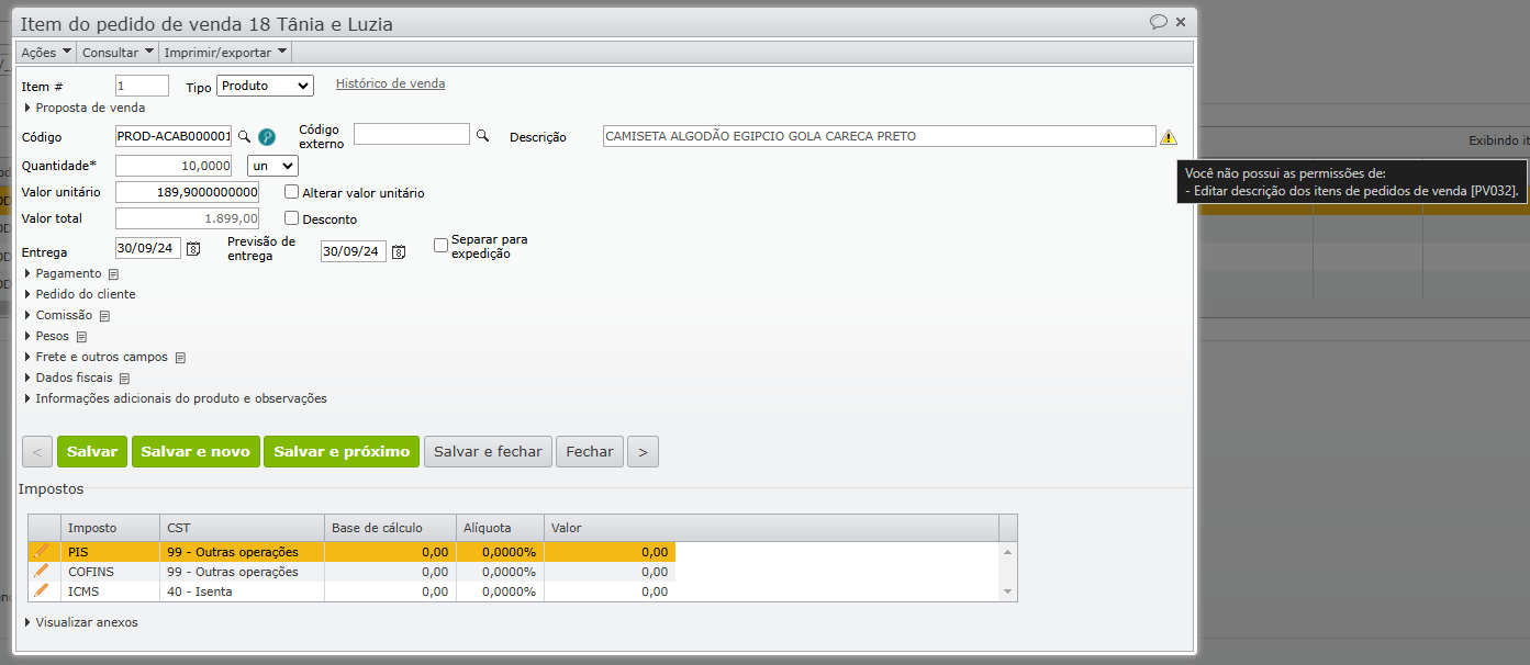 - Criadas novas permissões para proteger a edição do campo “Descrição” dos itens em pedidos de venda, notas fiscais, pedidos de compra, notas fiscais recebidas, propostas de venda e cotações de compra. Para saber mais sobre perfis de acesso e permissões, clique aqui.