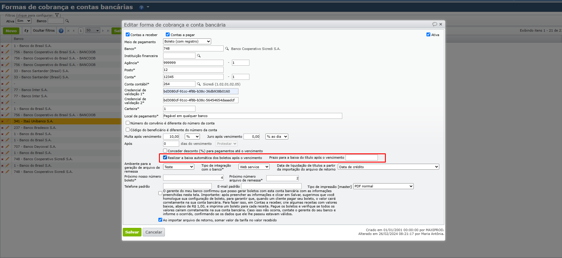 - Criadas as configurações que permitem definir instruções de baixa automática após o vencimento para boletos do Caixa Econômica Federal (104) e Banco Cooperativo Sicredi S.A. (748). Para saber mais, clique aqui.