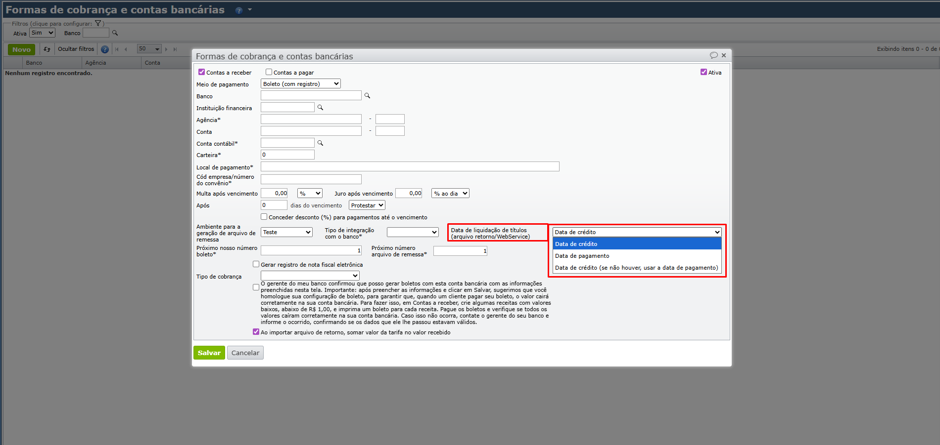 - Criada a configuração que permite a baixa automática de boletos via Webservice bancário utilizando a “Data de crédito” como a data de liquidação do título. Para saber mais, clique aqui.