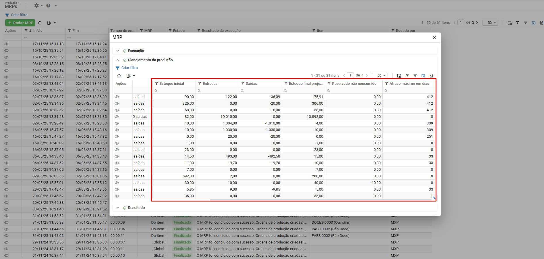 - Adicionadas as colunas “Estoque inicial”, “Entradas”, “Saídas”, “Estoque final projetado”, “Reservado não consumido” e “Atraso máximo em dias” na tela de planejamento de produção na nova versão do sistema. Para saber mais, clique aqui.