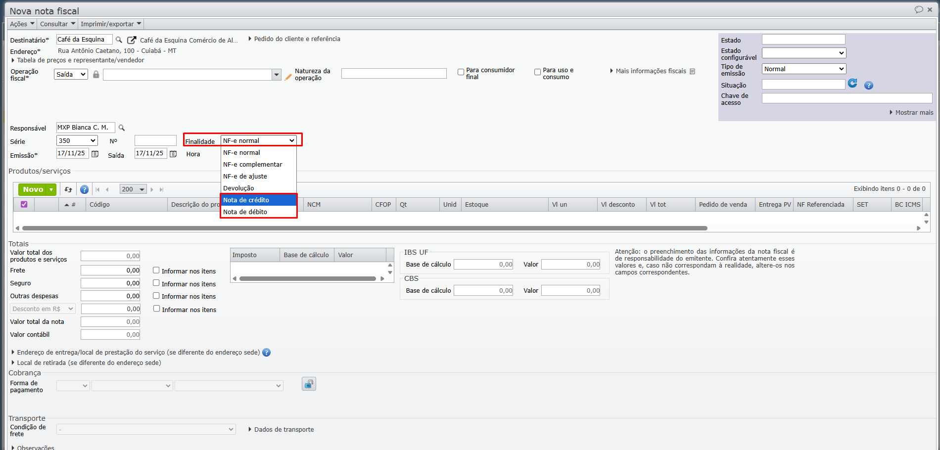 - Criadas as configurações que permitem a emissão de notas com as finalidades “Nota de crédito” e “Nota de débito” decorrentes da reforma tributária. Para saber mais, clique aqui.