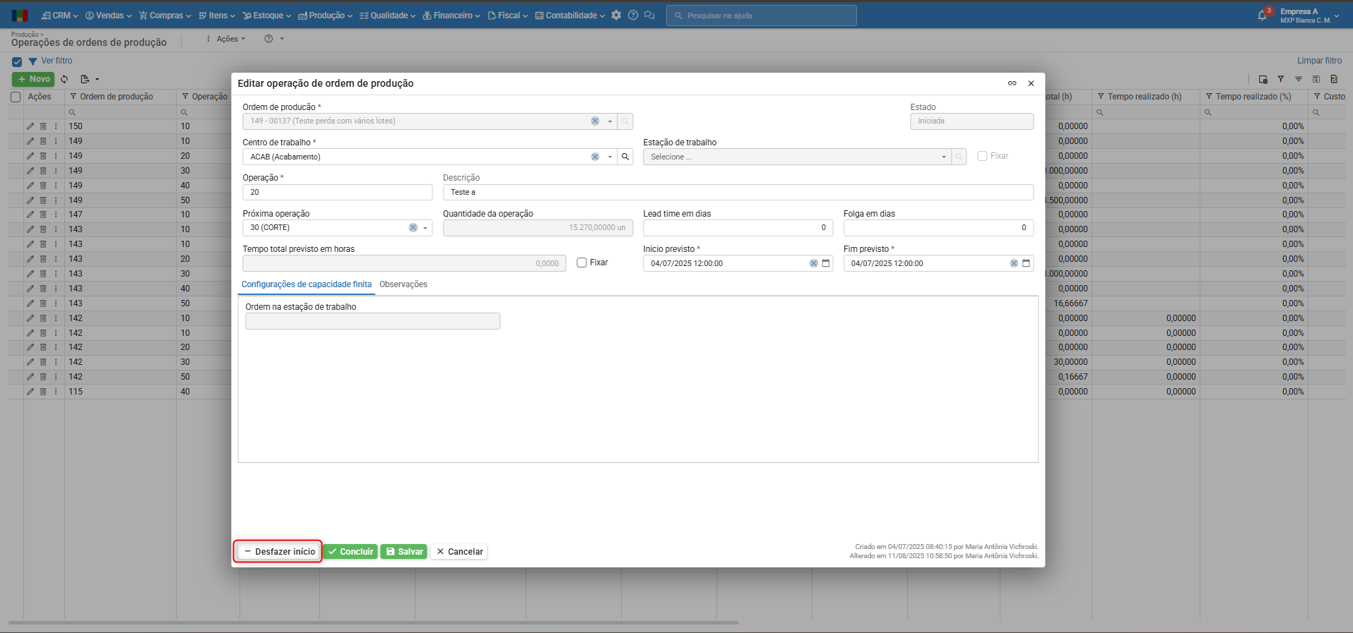 - Adicionados os botões de ação “Iniciar”, “Desfazer início”, “Concluir” e “Desfazer conclusão” na tela de edição de operação de ordem de produção na nova versão do sistema. Para saber mais, clique aqui.