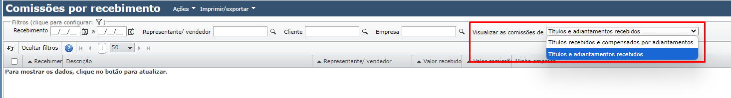 - Desenvolvido na tela de comissões por recebimento, novo filtro para a visualização das comissões de “Títulos recebidos e compensados por adiantamentos” e “Títulos e adiantamentos recebidos“. Para saber mais sobre comissões por recebimento, clique aqui.