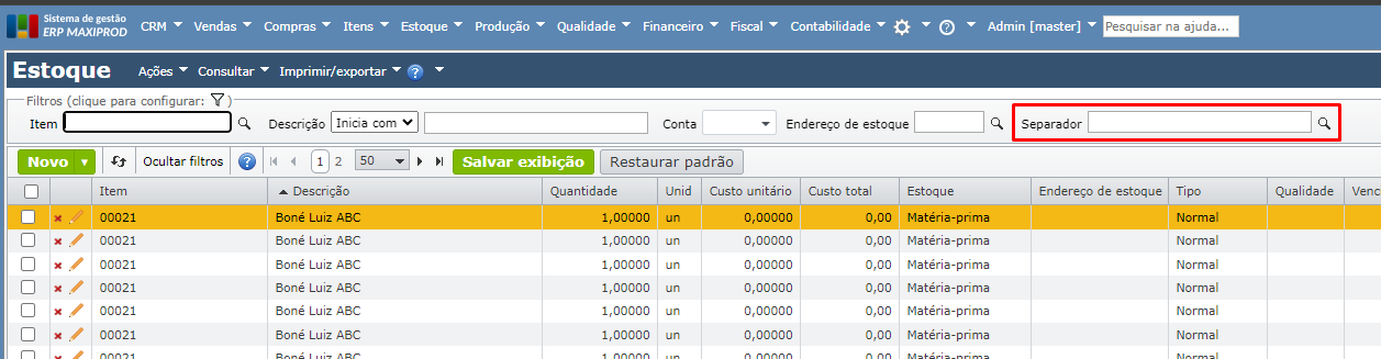 - Realizada melhoria na tela de estoque, com a inserção de um novo filtro nomeado “Separador”, para que seja possível a filtragem dos registros de estoque com base nos separadores existentes. Para saber mais sobre separadores, clique aqui.