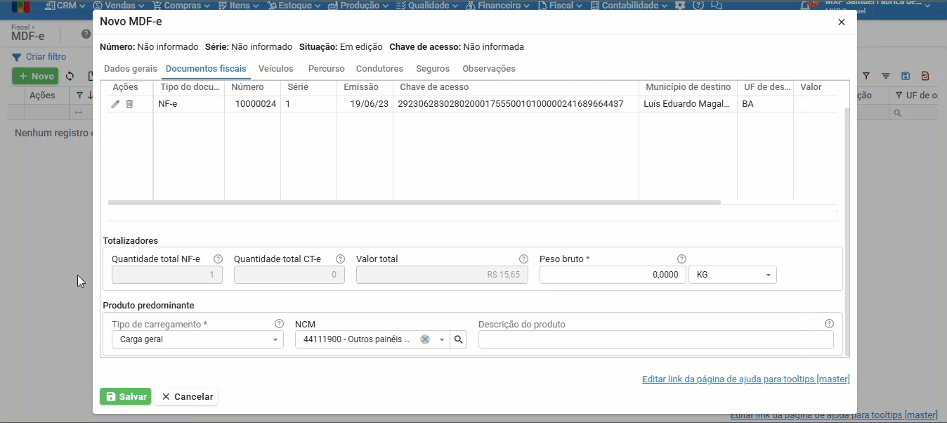 • Criado novo campo NCM na tela de MDF-e e incluída a opção “Granel pressurizado” no campo “Tipo de carregamento” da seção “Produto predominante”, buscando atender a NT 2025_001 (MDF-e). Para saber mais sobre MDF-e, clique aqui.
