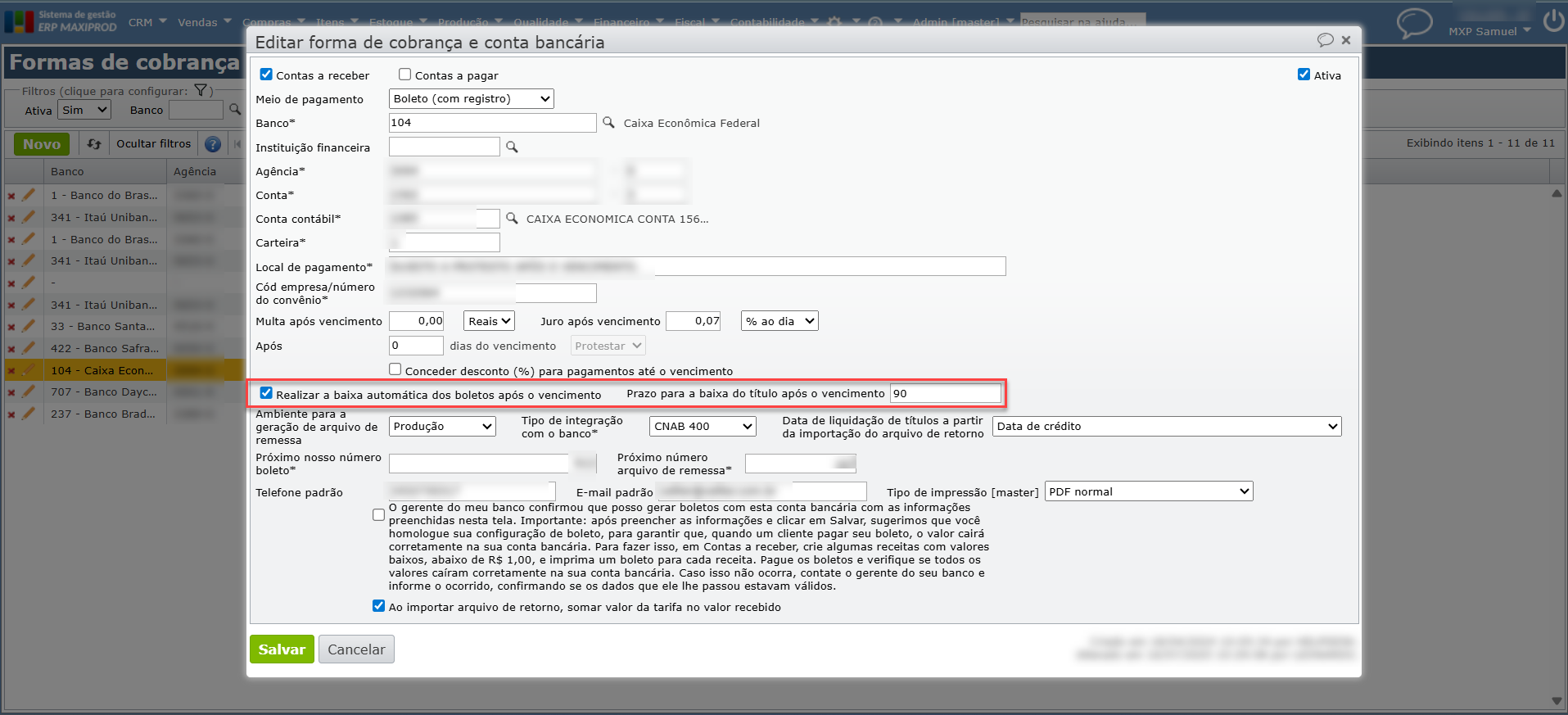 • Disponibilizada a configuração que permite definir o prazo para a baixa do título após o vencimento dos boletos da Caixa Econômica Federal, quando não houver protesto. Para saber mais sobre boletos bancários, clique aqui.