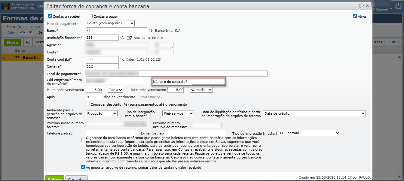 • Disponibilizado o campo “Número do contrato” no cadastro da forma de cobrança de boletos registrados do Banco Inter. Para saber mais sobre boletos bancários, clique aqui.