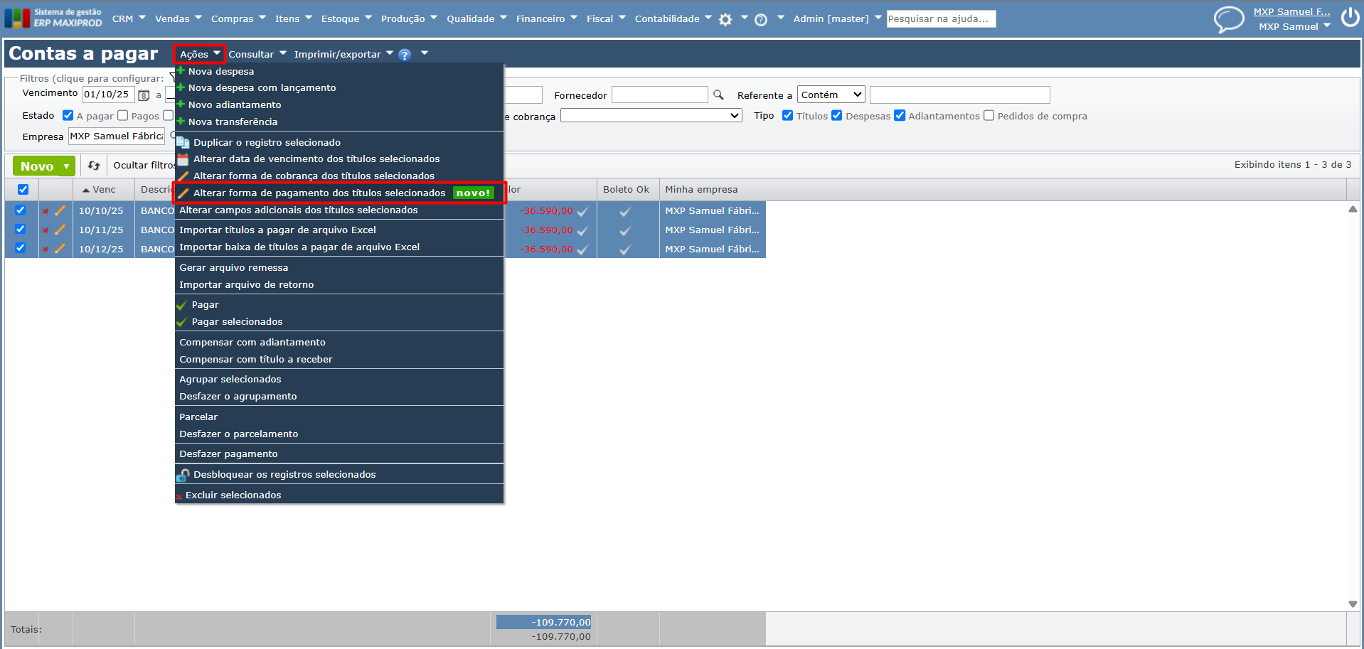 • Criado o menu que permite alterar em massa a forma de pagamento da seção “Dados de pagamento” nas contas a pagar. Para saber mais, clique aqui.