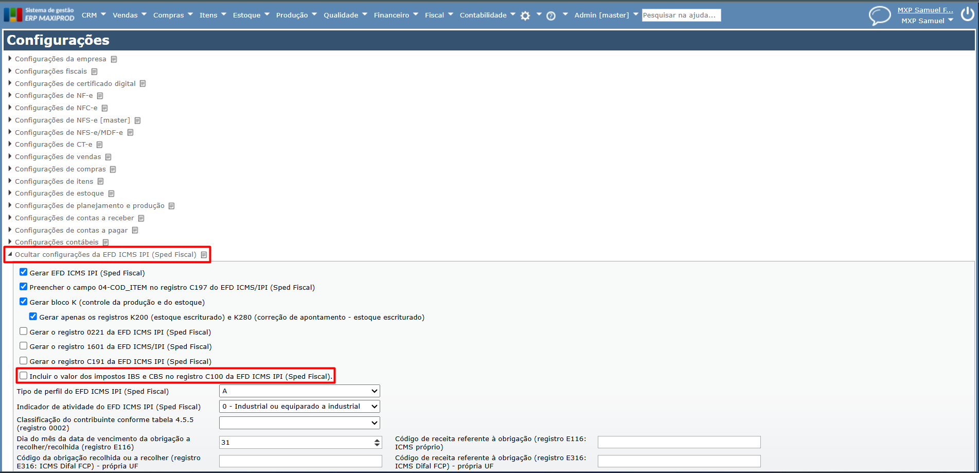 • Disponibilizada a configuração que permite incluir o valor dos impostos IBS e CBS no registro C100 da EFD ICMS IPI (Sped Fiscal). Para saber mais sobre reforma tributária, clique aqui.