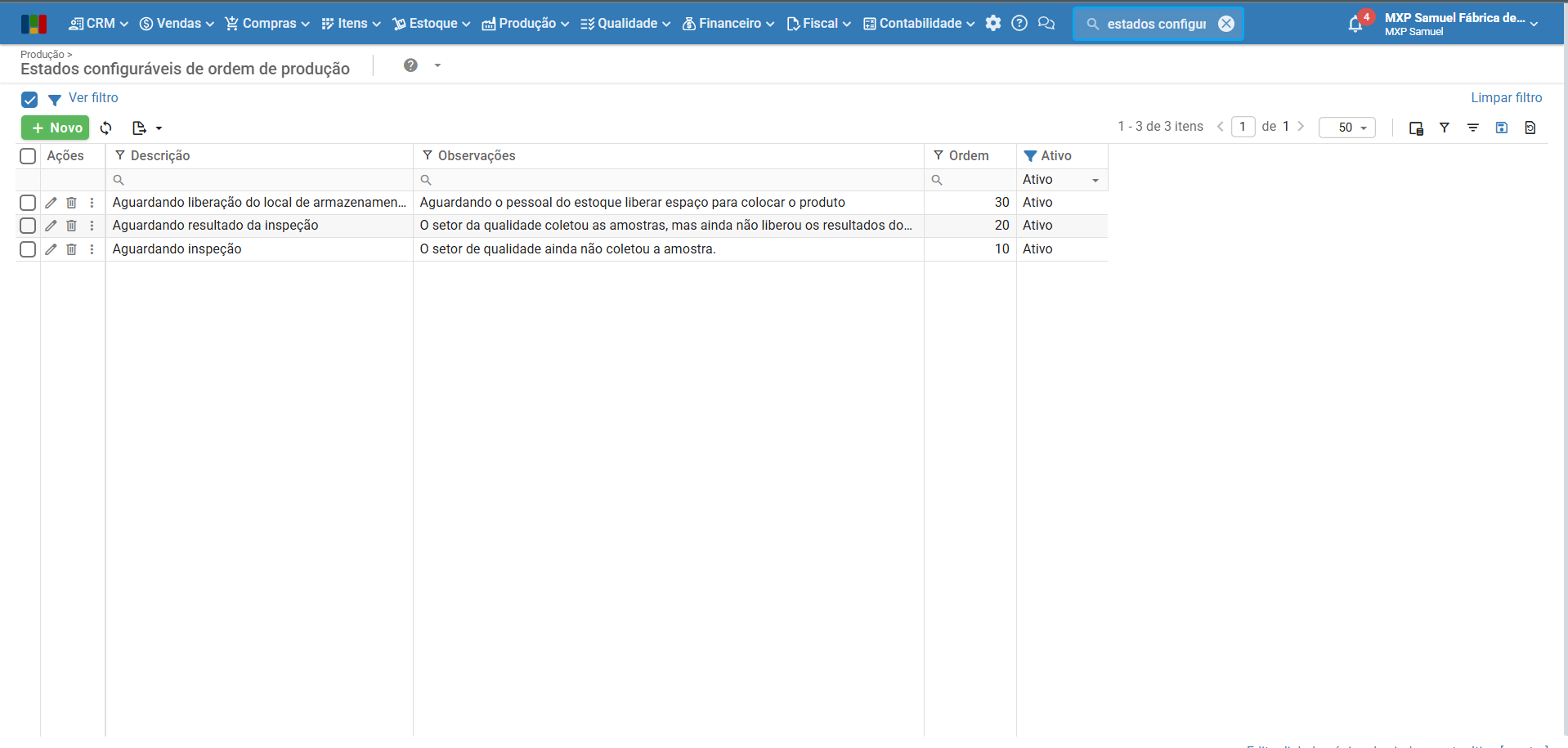 • Disponibilizada uma nova tela para o cadastramento de estados configuráveis das ordens de produção. Para saber mais, clique aqui.