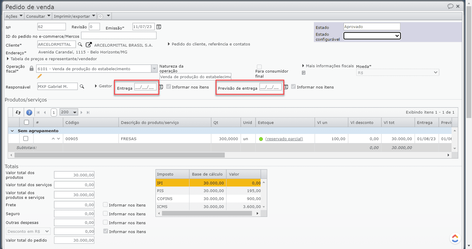 - Adicionada nova tag nos dicionários de pedido de venda e pedido de compra, referente a data de entrega e previsão de entrega. Para saber mais sobre tags e relatórios personalizados, clique aqui.