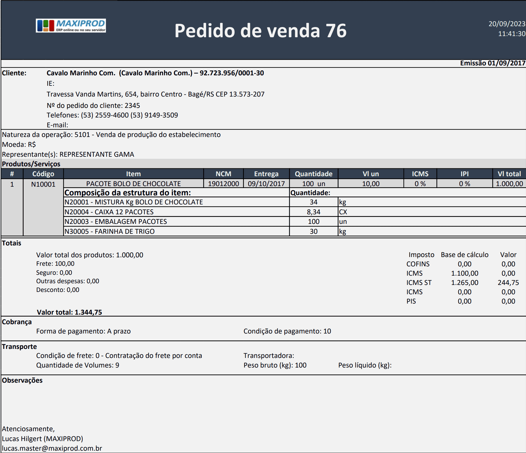 - Disponibilizado na tela de pedido de venda, um novo relatório nomeado “Relatório da composição dos itens do pedido de venda.xlsx”, para listar a composição da estrutura dos itens do pedido de venda. Para saber mais sobre relatórios personalizados, clique aqui.