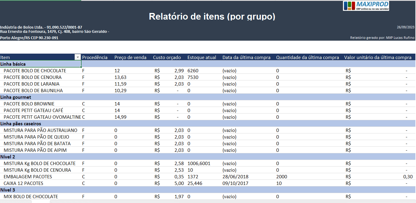 - Disponibilizado na tela de itens, um novo relatório nomeado “Relatório de itens (por grupo).xlsx” para listar o preço de compra, preço de venda e procedência dos itens cadastrados, organizados por grupo. Para saber mais sobre relatórios personalizados, clique aqui.