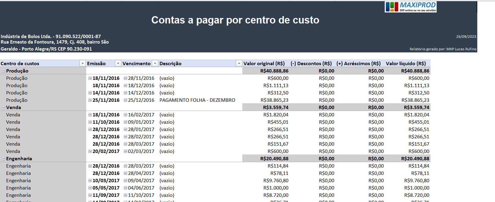 - Criado novo relatório de pagamentos por centro de custos na tela de contas a pagar. Para saber mais sobre relatórios personalizados, clique aqui.